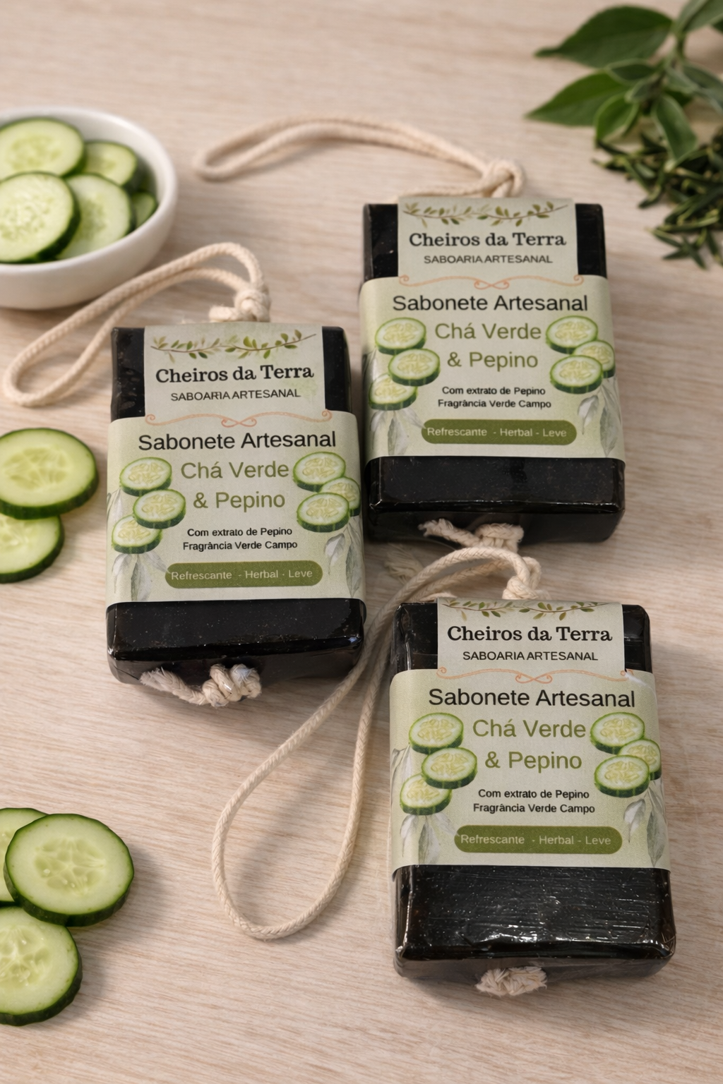 Composição: Base glicerinada, lauril, essência de verde campo, extrato de pepino, extrato em pó de chá verde e manteiga de cupuaçu.