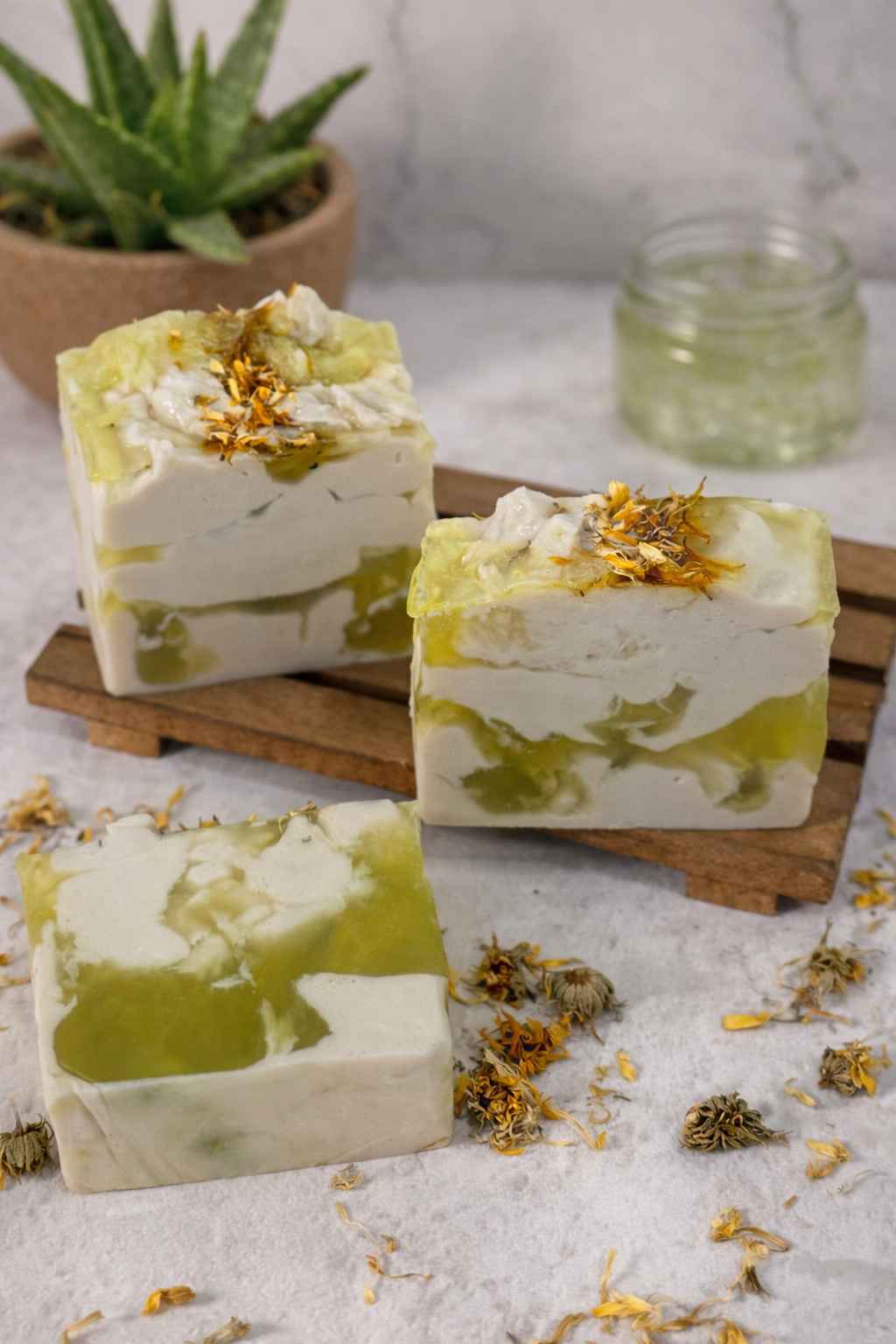 COMPOSIÇÃO: BASE GLICERINADA, ESSÊNCIA DE PRIMAVERA COM ALOE VERA, LAURIL, EXTRATO DE ALOE VERA E CALÊNDULA, ÓLEO DE COCO, DOLOMITA, CORANTE COSMÉTICO E PÉTALAS DE CALÊNDULA.