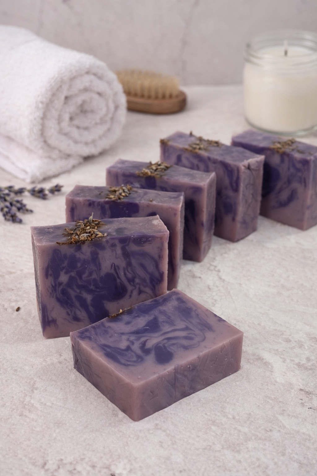 Composição: Base glicerinada, essência de lavanda, lauril, extrato de lavanda, óleo de coco, pigmento cosmético.