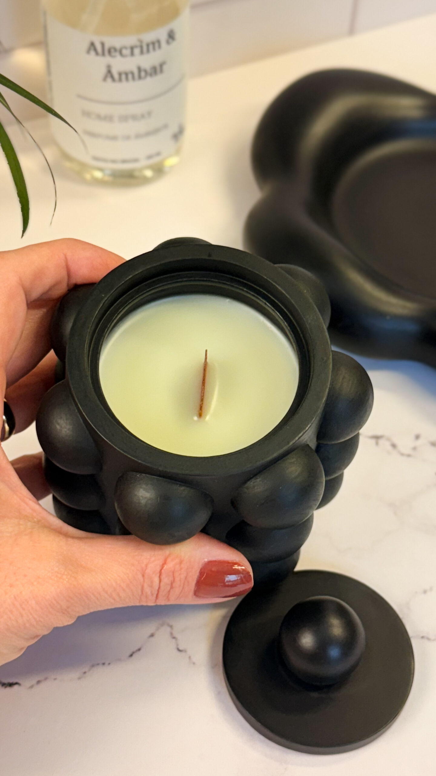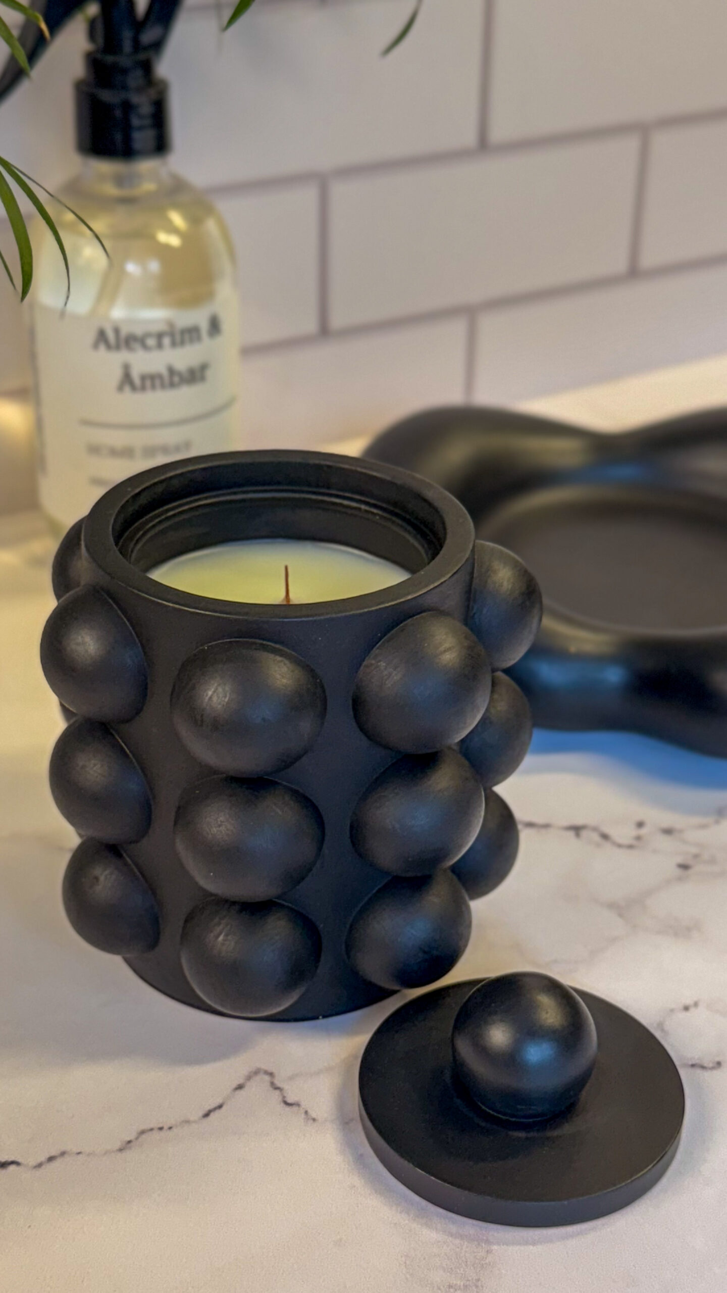 Design contemporâneo e presença marcante. A Vela Bubble é moldada artesanalmente em resina, com acabamento preto fosco e textura volumosa que confere personalidade e sofisticação à peça.